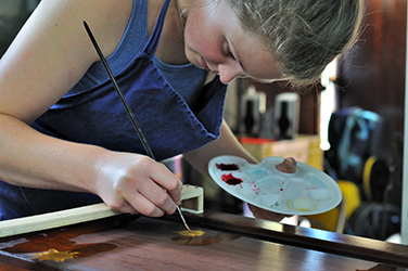 Elle exerce la laque et la dorure dans son atelier, en France ou à l’étranger, sur des créations, des rénovations, des restaurations, ou des collaborations. Curieuse et véritable globe-trotteuse elle apprécie, au fil de ses rencontres, les échanges humains, artistiques et culturels.